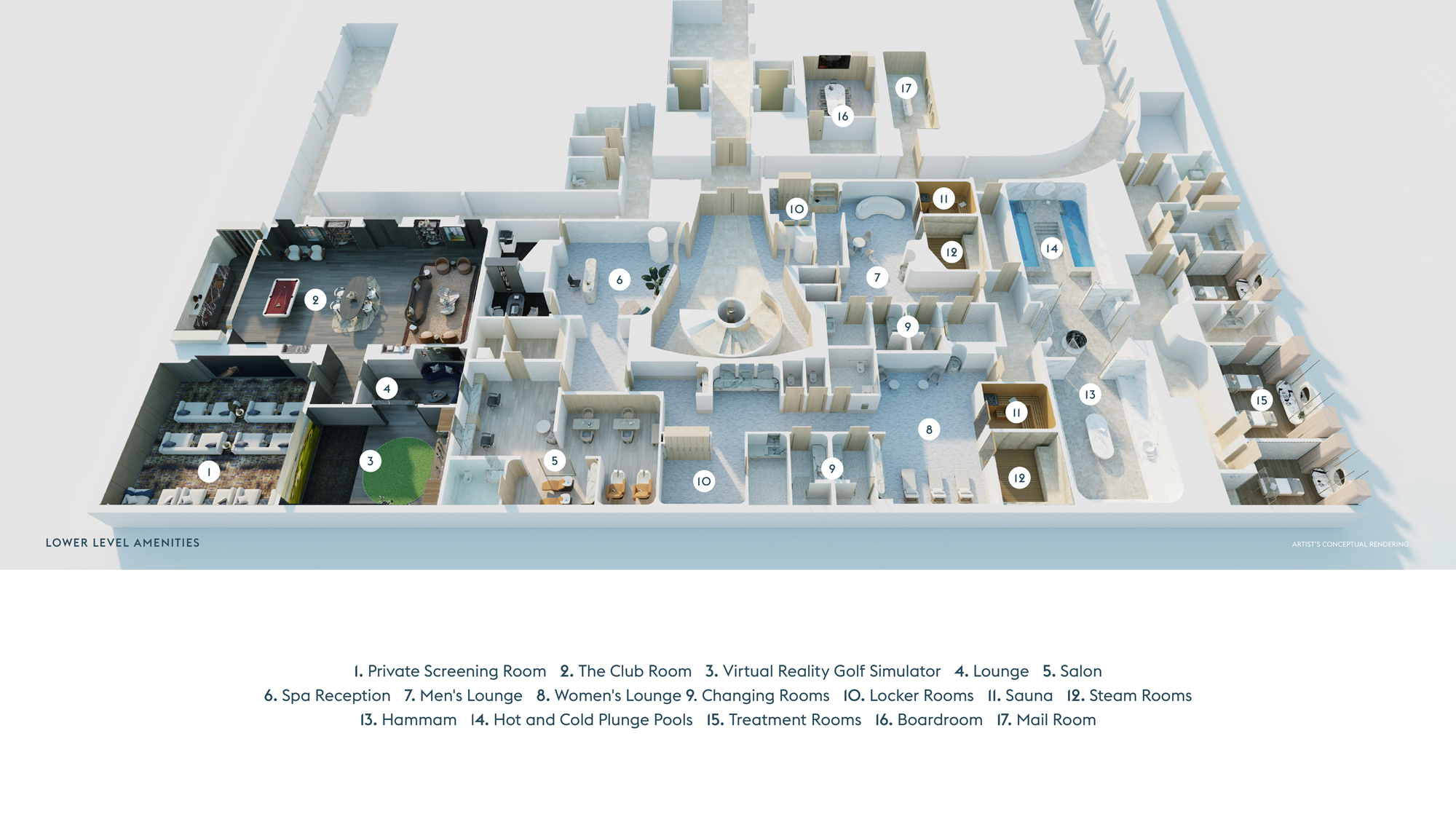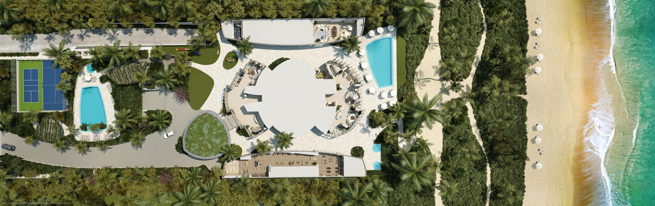 1 Pickleball and Padel Courts 2 Sunset Pool 3 Private Driveway 4 Private Dining 5 Lobby 6 Formal  Lounge 7 Fitness Pavilion 8 Gallery 9 Media Room & Library 10 Cocktail Lounge 11 Spa/Wellness Entry 12 Sunrise Pool 13 Beachfront Dining 14 Dedicated Beach